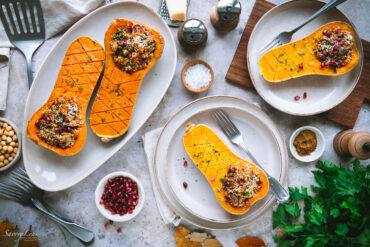 Gefüllter Butternut-Kürbis mit orientalischem Quinoa-Risotto & Granatapfel