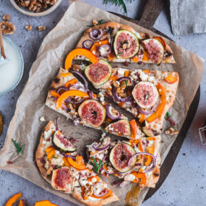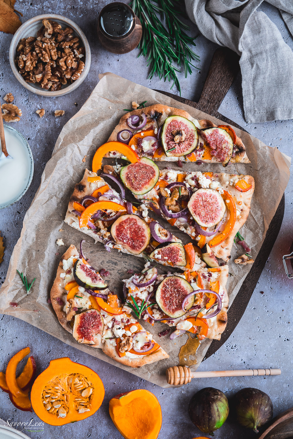 Knusprige Pinsa mit Kürbis, Speck und Feigen