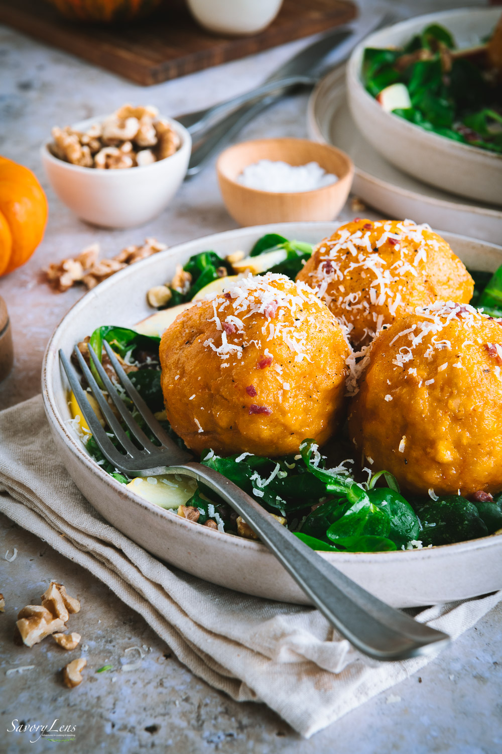 Kürbisknödel auf lauwarmem Feldsalat mit Apfel und gerösteten Walnüssen