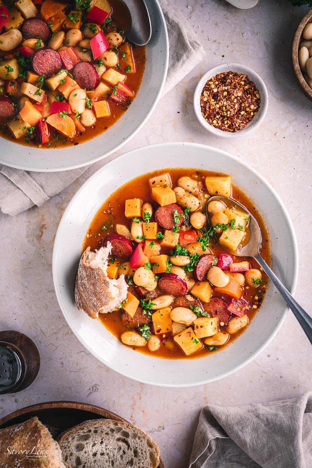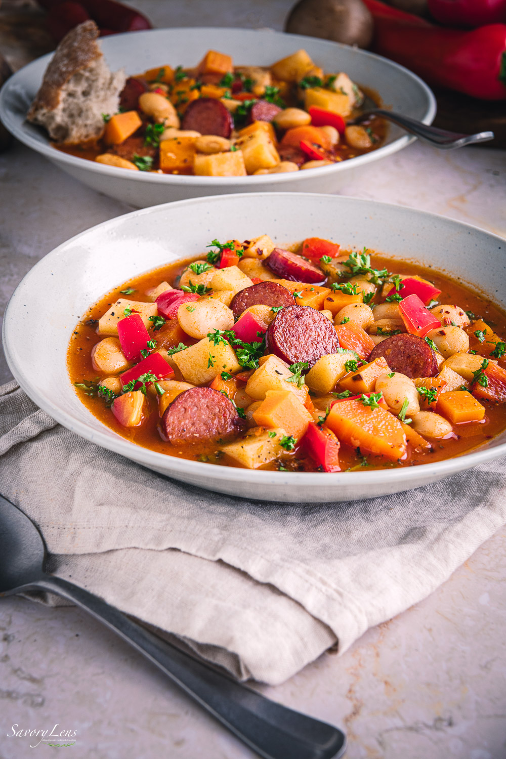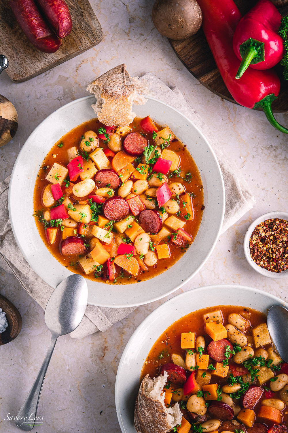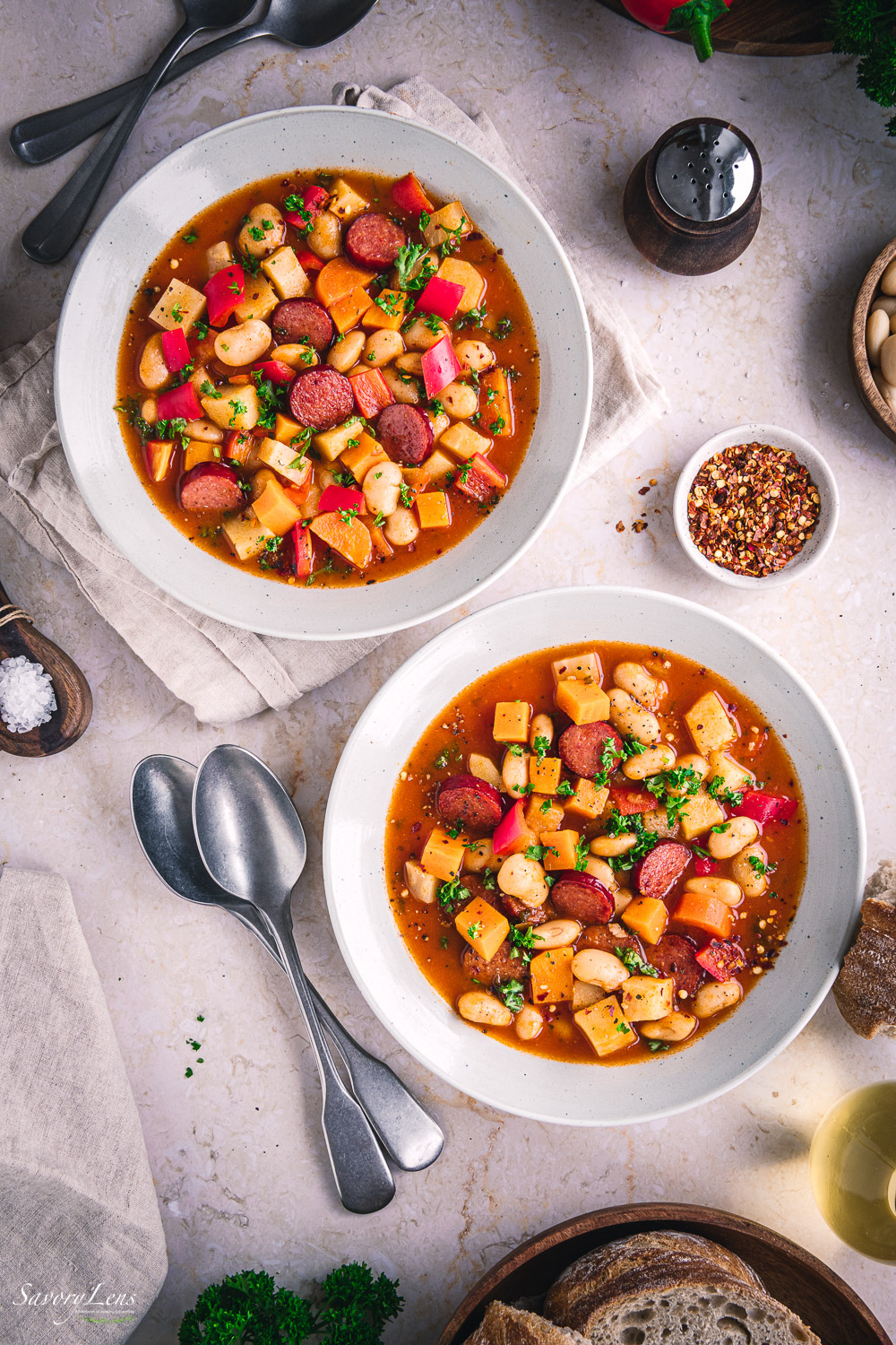 Karotten, Pastinaken, Sellerie und Süßkartoffeln liefern natürliche Süße und Röstaromen, während weiße Bohnen (z. B. Cannellini oder große Weiße) den Eintopf binden und ihm Körper geben. Chili und Paprikapulver setzen einen pikanten Kontrapunkt – nicht scharf um der Schärfe willen, sondern wärmend und aromatisch. Wer möchte, verfeinert das Ganze noch mit pikanter Paprikawurst. Wir haben uns für eine Kabanos Paprika entschieden.