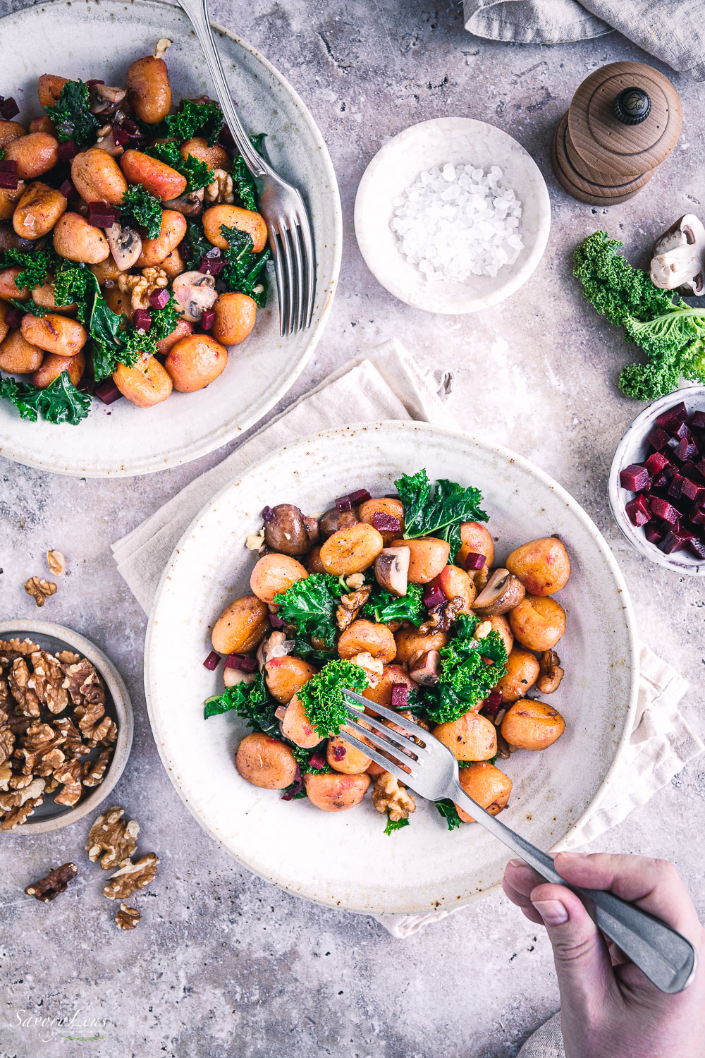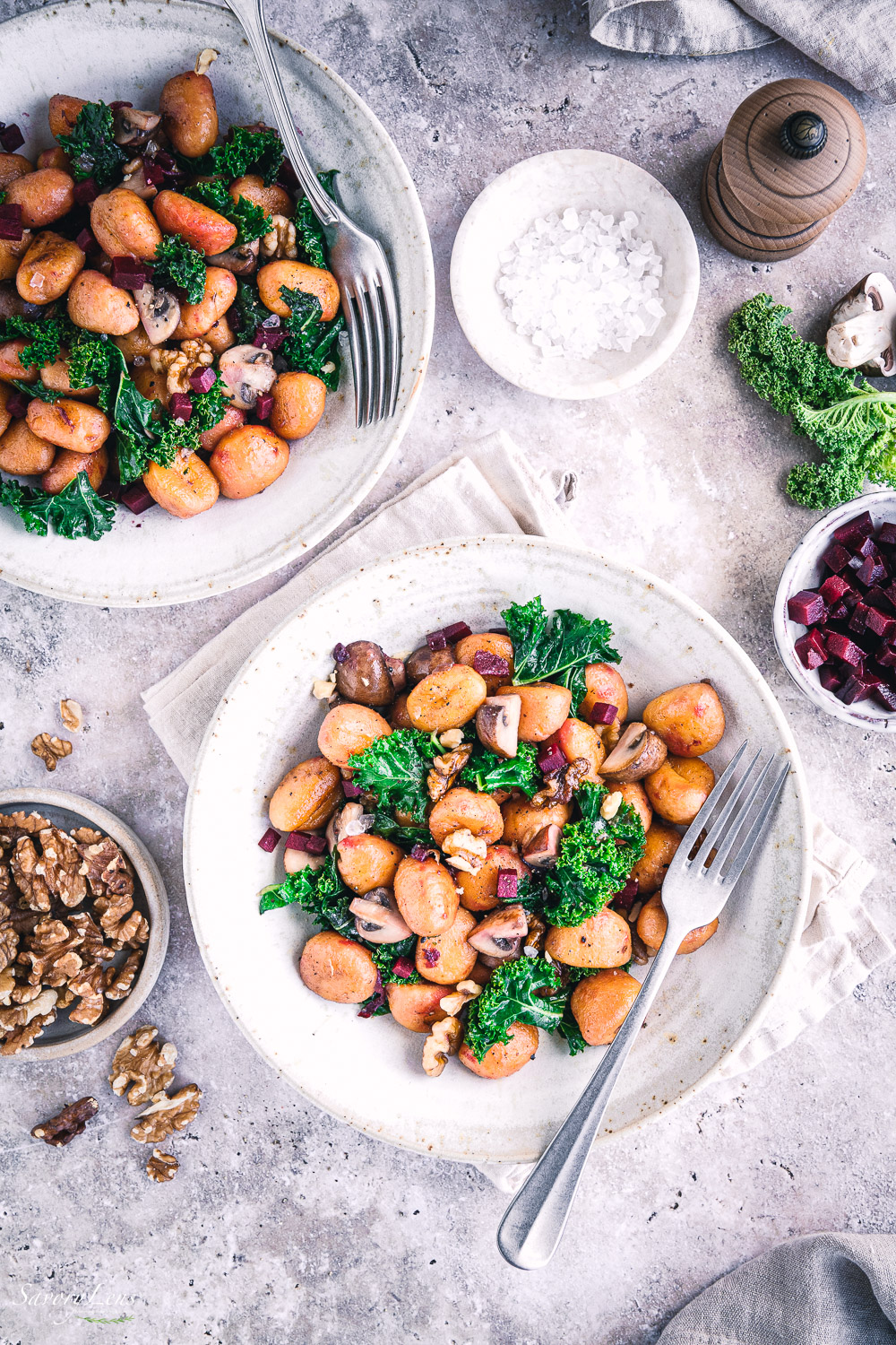 - In einer großen Pfanne das Olivenöl erhitzen (wer mag gibt noch eine Flocke Butter dazu). Die Champignons goldbraun braten, die Schalotte zugeben, dann den Grünkohl kurz mitschwitzen. Rote Beete in Würfel schneiden und dazugeben. Zu guter Letzt die Süßkartoffel-Gnocchi in die Pfanne geben und kurz mitbraten, bis sie leicht gebräunt sind. Mit Salz und Pfeffer abschmecken und die gerösteten Walnüsse beigeben.