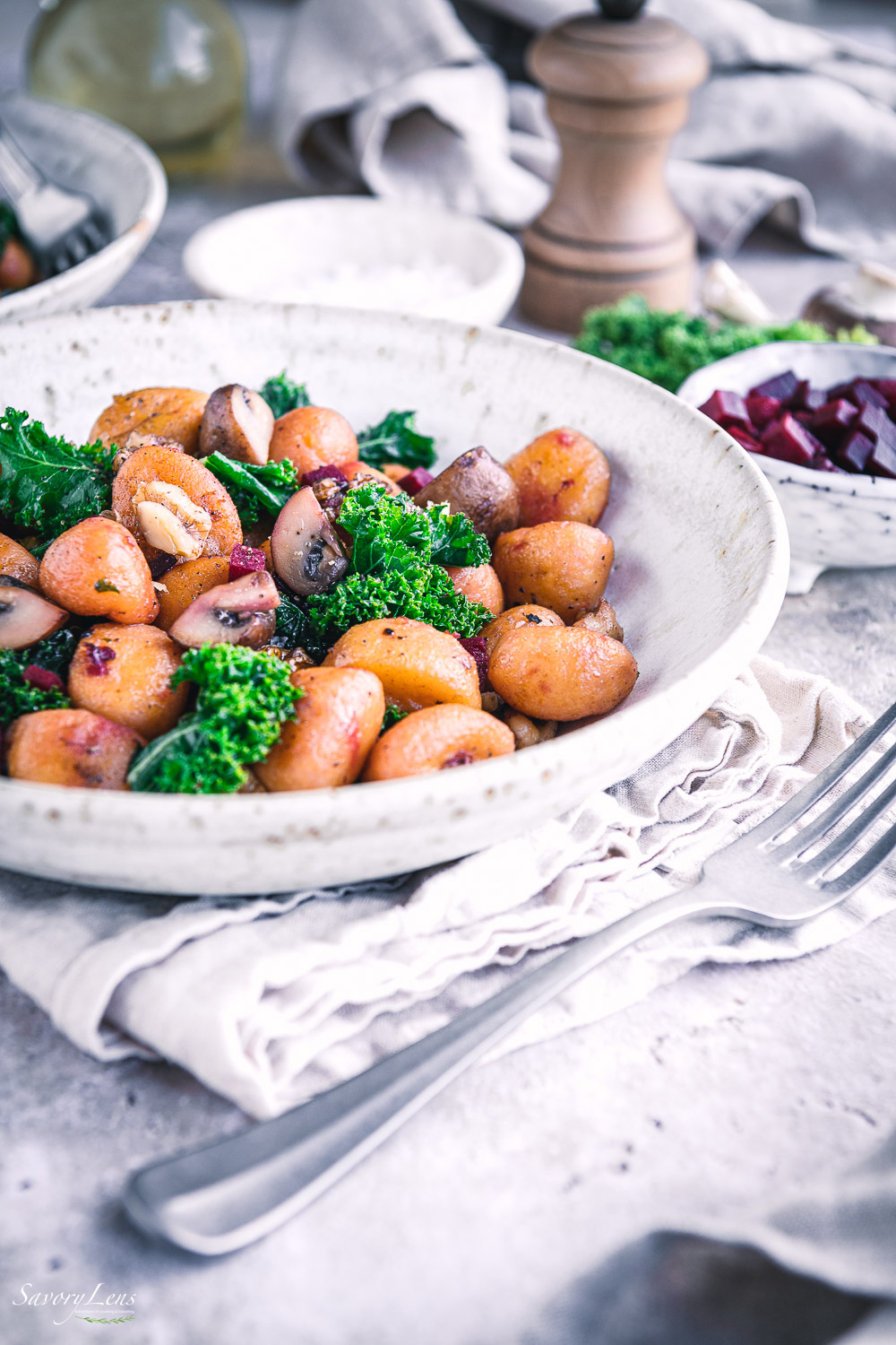 Süßkartoffeln bringen nicht nur Farbe auf den Teller, sondern auch eine natürliche Süße und Cremigkeit. Dadurch benötigen die Gnocchi weniger Mehl als klassische Kartoffelgnocchi und werden besonders fein. Kombiniert mit Grünkohl, einem echten Winterklassiker voller Geschmack, entsteht ein ausgewogenes Gericht, das sättigt, ohne schwer zu wirken. Mal eine schöne Abwechslung zu klassischen Gnocchi wie in unserer Gnocchi-Grünkohl-Pfanne mit Pilzen und getrockneten Tomaten. Neben den Champignons kommt bei uns heute noch ein wenig Rote Beete hinzu. Eine Packung vorgekochter Roter Beete haben wir im Winter meist im Haus, und aus 1-2 Knollen werden einfach ein paar Würfel unseren Gnocchi beigegeben.